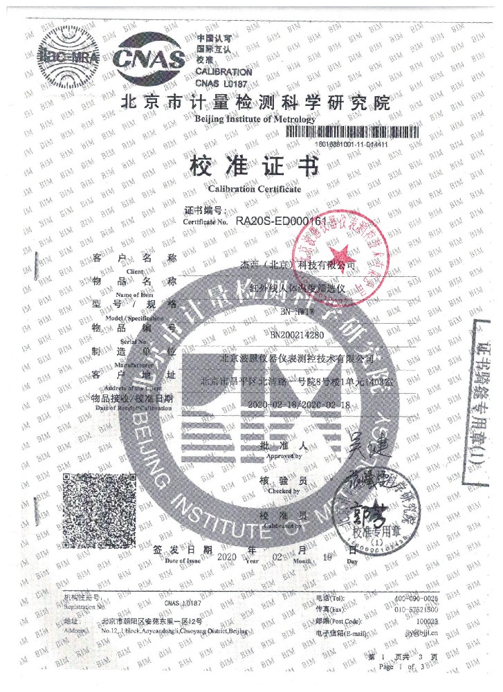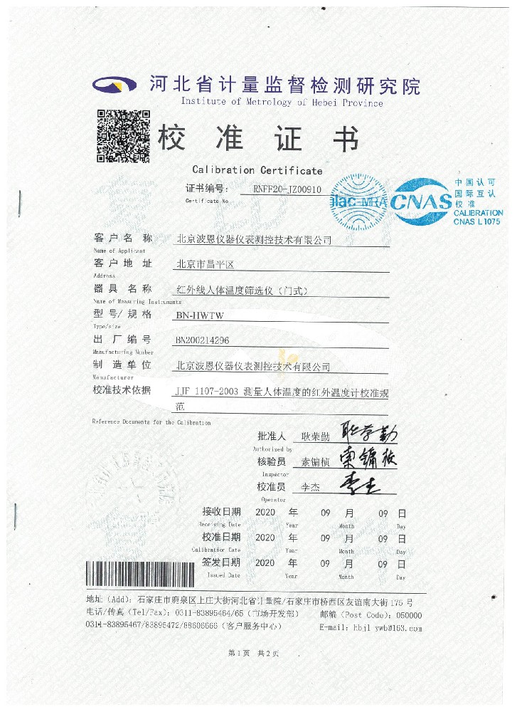 波恩儀器公司立柱式紅外線人體溫度篩查儀北京市計(jì)量院校準(zhǔn)證書(shū)